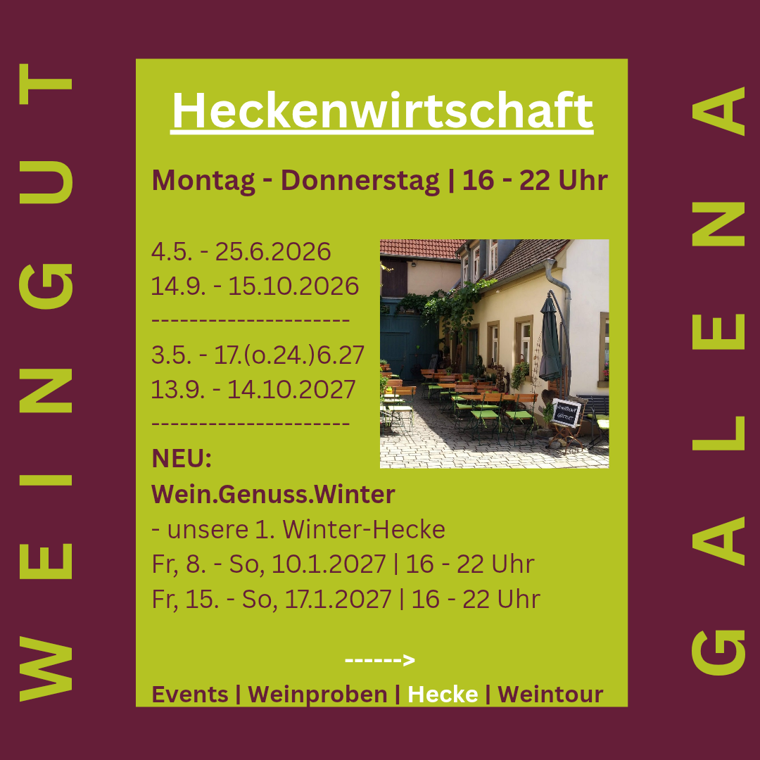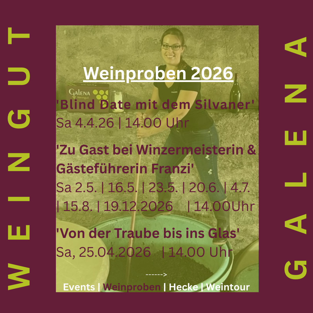 Reservierung unter: Reservierungs-Anfrage,per Mail (info@weingut-galena.de) oder Telefon (09381-9368)